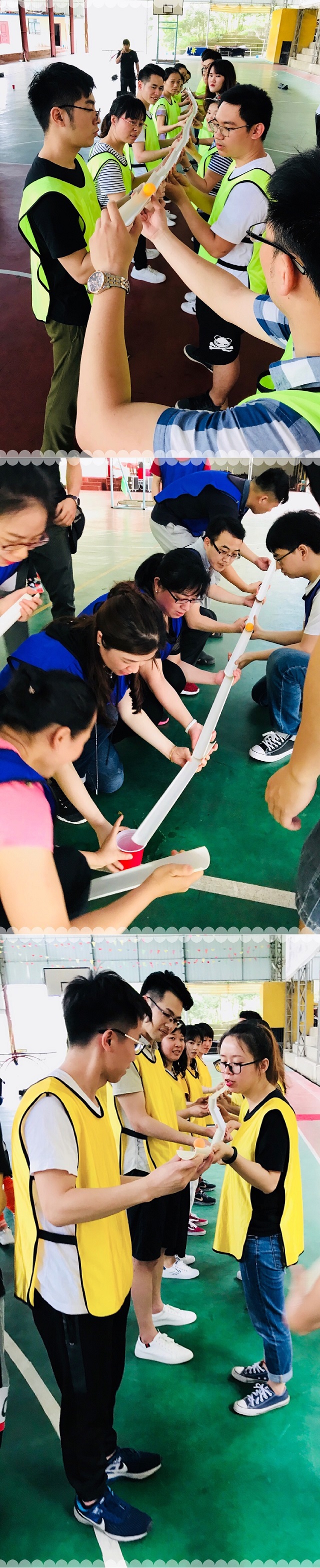 “南水北调”比赛要求团队将乒乓球通过竹筒运送到另一端的水桶里。主要考验大家对球流动的速度把控、空间评估、接力速度等能力,只有连续不卡壳的接力才能将球快速顺利地运送到水桶里。