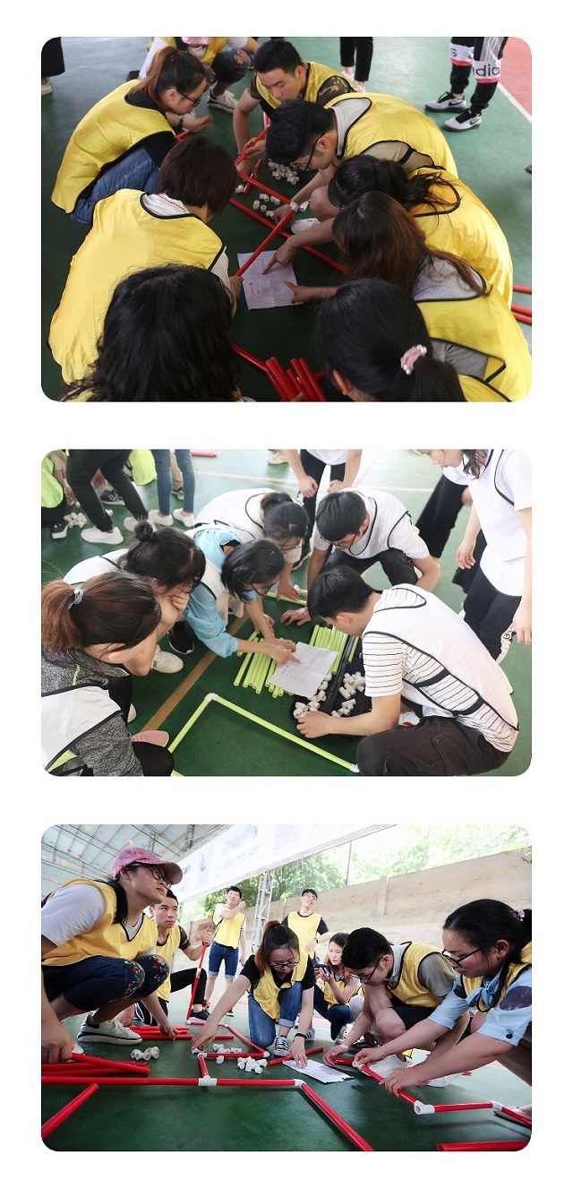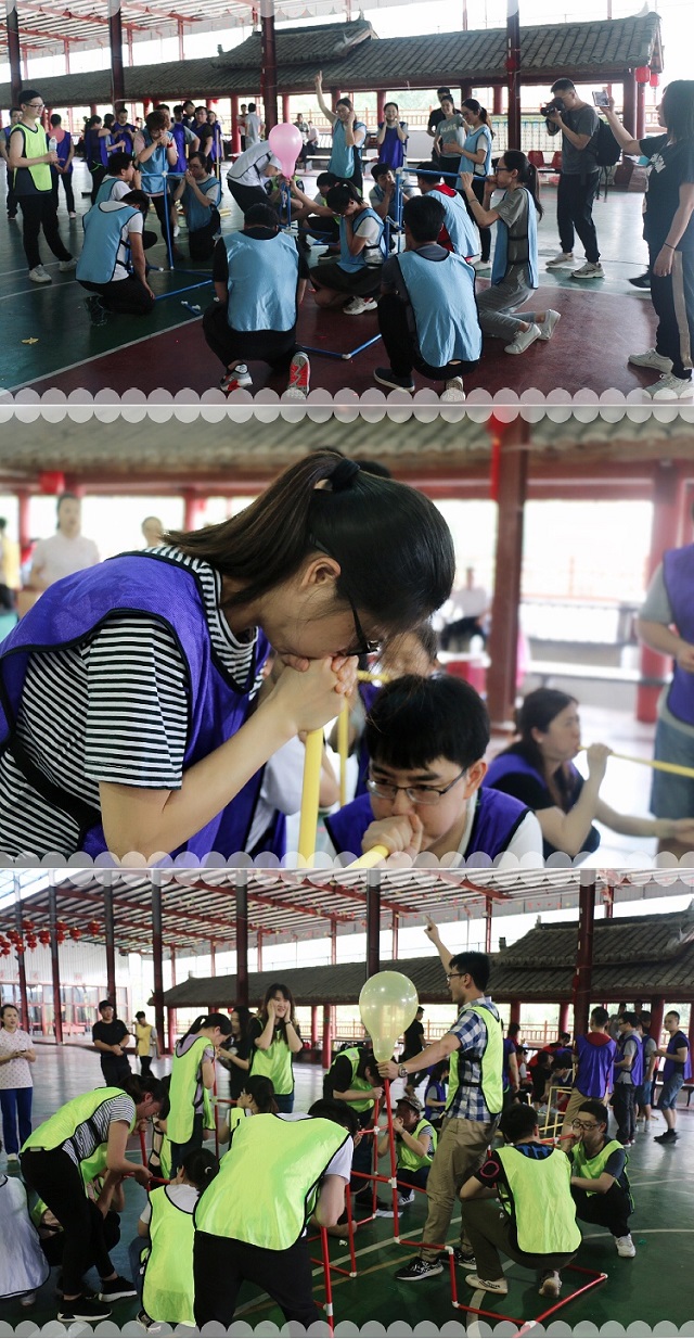 作为本次比赛的重头戏——“呼吸的力量”,让大家苦恼不已但又频频点赞。各队根据图形指示将原本长短不一的水管和不同的衔接口组成3D立体模型,并按要求保留12个吹气口和1个出气口,将套在出气口的气球吹破三个即为通关。当拿到这一堆模具的时候,大家已经一头雾水,纷纷犹豫不决。随着教练提醒时间的进度后,各队的男生主动挑起大梁,研究图形、比对模具,队里的女生认真配合着男生的指挥,一切按照图纸设置的流程来,一个片区一个片区的检查比对,一个端口一个端口的检查校正,不容许有一丝错误,因为每一个小细节出现问题都会前功尽弃。这时候,每一队的组装画面就是一个小小加工厂,每一帧画面都洋溢着团结协作的气息,正在各队陷入胶着状态的时候,随着教练一声声振奋的“一二一”指令响起,终于有队伍率先打破了组装的僵局,12个吹气口连接上12名队员的呼吸,大家呼吸一致,共同吹气,气球爆破的响声振奋了场上所有的队员。从来没有觉得气球爆破也如此悦耳,原来是胜利的号角,是成功的欢呼声。在一次次气球的爆破声后,场上尽是狂喜、呼喊、击掌、跳跃的青春画面,汗水挥洒着胜利的喜悦,笑声拉近了大家陌生的内心,活动结束后,大家围坐一起分享成功的喜悦与心得,畅谈着彼此的学习生活工作。